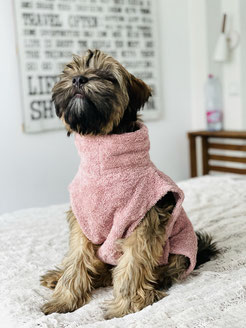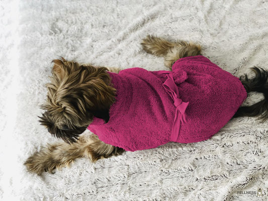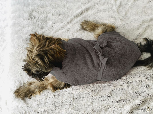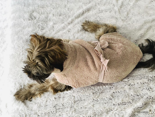 Der Hundebademantel kann bei 60 Grad in der Waschmaschine gewaschen werden und ist für den Trockner geeignet.